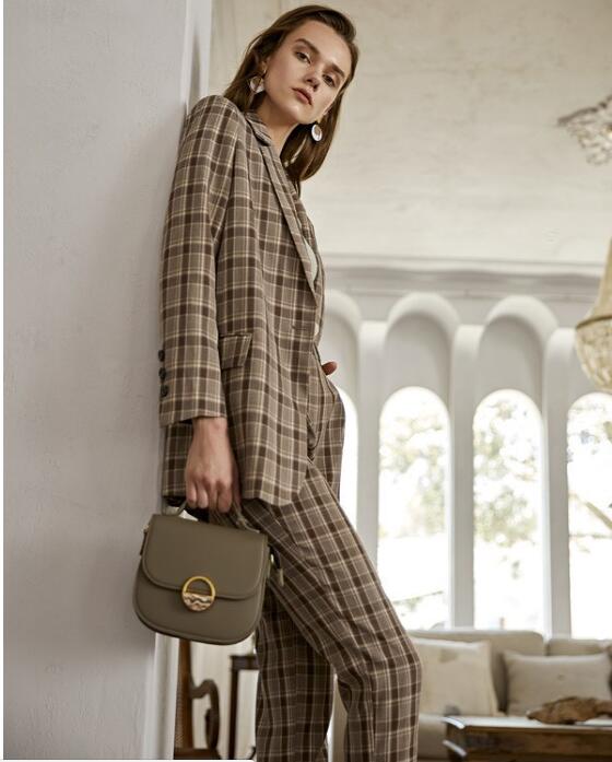 这款格纹套装的搭配很适合上班族哦,黄色与咖色的格纹搭配在一起复古又时髦,而且版型穿在身上很是修身很是好看,翻领的设计很显气质,内搭一件白色上衣,V领的设计露出性感的锁骨曲线,下身搭配一件格纹西装裤,很是这款衣服不用费心穿搭, 就可以将自己的时髦气质,搭配一双高跟鞋, 整体的造型很是优雅大方。