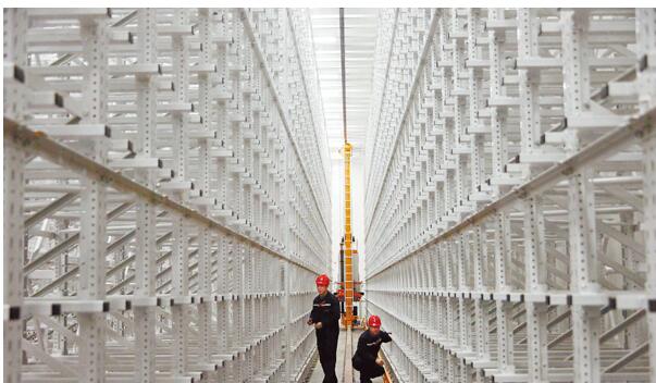 1月7日,在坐落高新区的中航锂电(洛阳)产业园三期工程项目现场,工作人员正在调试自动化库房有关设备。该库房总库存量为120万个锂电池。