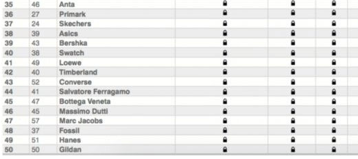 下表爲本次榜单的 50个时髦品牌: