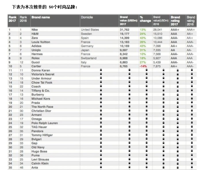 瑞典快时髦巨头H&M与去年坚持分歧,位居第二,品牌价值190亿美元;西班牙快时髦品牌Zara上升一位至第三,品牌价值144亿美元;法国朴素品牌Louis Vuitton(路易威登)从去年的第三名下滑至第四,品牌价值132亿美元,是榜单中品牌价值最高的朴素品牌。