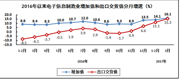 出产持续加速,出口较快增加。一季度,规划以上电子信息制造业增加值同比增加14.9%,同比加速6.3个百分点;快于悉数规划以上工业增速8.1个百分点,占规划以上工业增加值比重为7.3%。其间,3月份增速为16.1%。出口交货值同比增加13%(上一年同期为降低6.3%)。其间,3月份出口交货值同比增加15.3%。