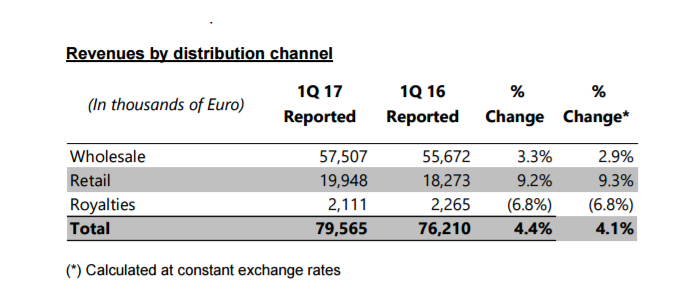 批发途径:出售额同比增加 3.3%至 5750万欧元,占总出售额的 72.3%