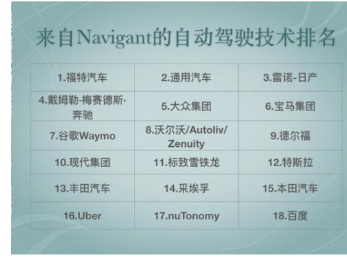 在这个全部公司都“闭门造车”的期间,baidu发布了它的阿波罗计划:开源自己的智能驾御途径。为何baidu要打开途径呢?我们先来看一个Navigant智能驾御研讨水平的排行表。
