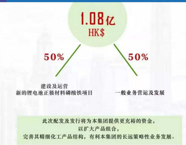 关于这次配发及发行,彩客化学集团主席戈弋先生表明,跟着全球环保认识增强,高性能的正极电池资料商场需要高速添加,彩客化学把握此开展机会,进入制作磷酸铁的商场,以拓展集团的精密化工商品组合。另一方面,在公司事务规模不断拓展,加上现有商品扩产完结及新商品连续投产的背景下,运营资金需要不断添加,以支撑技术研制及人才引进之需要。这次配售不只拓展了集团的股东根底,更将进一步添加集团的资金实力,为集团将来的开展带来新的添加点。将来,集团将持续使用本身技术研制优势及于精密化工领域积累的丰厚出产经历,积极开辟新商品及新事务板块,完成集团横向拓展的战略目标。