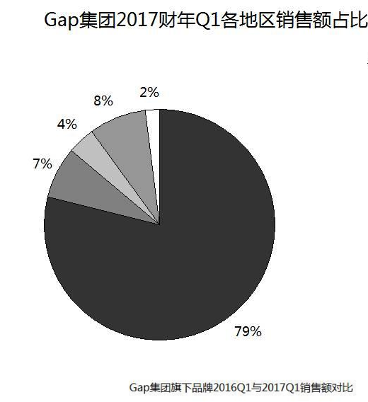图为Gap集团2017与2016财年Q1各品牌在全球各区域的成绩数据