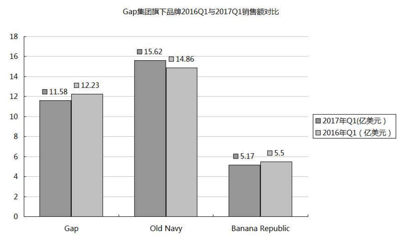 图为Gap、Old Navy和Banana Republic三个品牌2016年Q1和2017年Q1成绩数据 时髦头条网数据制表。