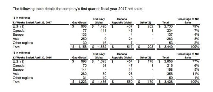 GPS)今天发布2017年第一季度财报数据,在到4月29日的三个月内,集团出售额根本与去年同期持平录得34亿美元,净利润则大涨12.6%至1.43亿美元,作为零售最关键的目标同店出售,相较去年同期5%的跌幅有显着改进,录得增加2%。