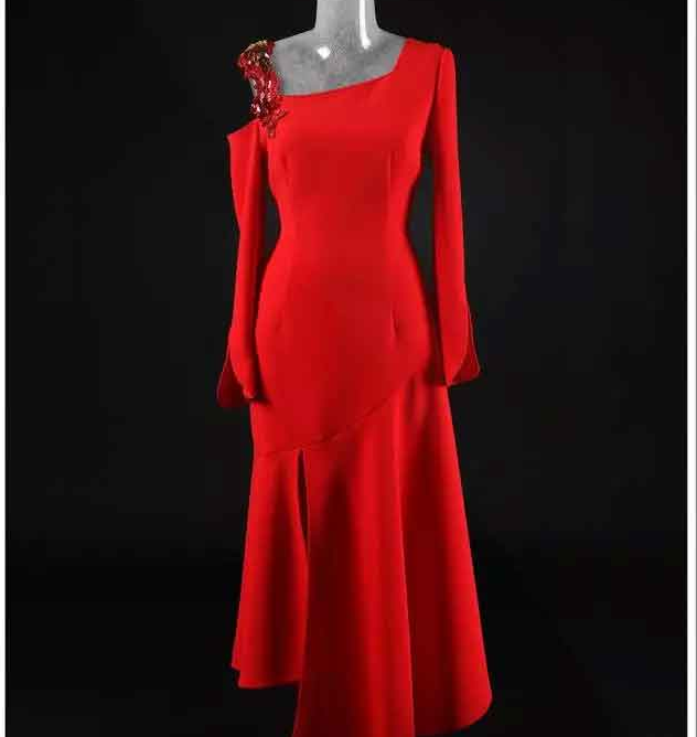 魅惑的赤色,融合在美人鱼下摆规划的连衣裙上,极富浪漫气息,让人想起午夜里性感又风险的缪斯,踏着闪亮高跟鞋,涂上复古口红,微露香肩,惊鸿一瞥,让人窒息。