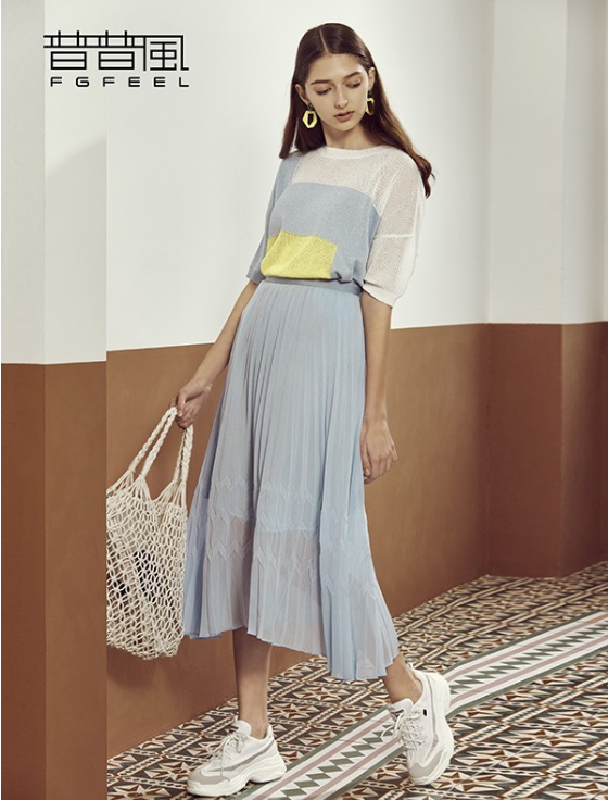 蓝色的裤装或者裙装都可以利用小白鞋类搭配,一款小白鞋走四季,你可以尝试看看,蓝色也可以作为拼接的颜色,半身裙上点缀蓝色更加的有魅力,百褶的效果呈现也很显魅力效果,赶紧来试试看吧。