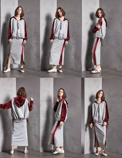进口卫衣料加天鹅绒,简练裁剪,抽松紧处理衣摆,舒适套头连帽取舍,高街风范,裙子松紧腰头,穿戴舒适无拘束,抽绳细节提高运动风气,双侧斜插袋,裙摆开叉,便于行走,展示性感魅力。