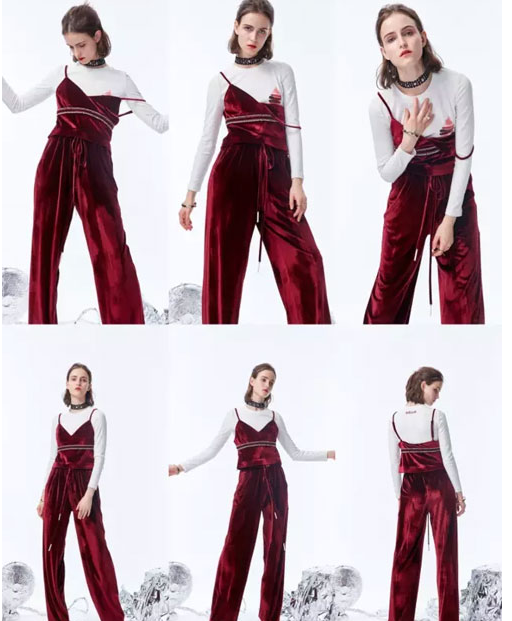 天鹅绒有光泽,有弹性,性感深V规划,后背飘带,浪漫详尽,特别双肩吊带,能够自由调理,穿戴舒适耐用,精美织带装点,层次分明。侧兜有简练手插袋,整烫工艺推翻传统车边细节,视觉摩登新潮,选取精美抽绳,进行车缝工艺,平添时髦休闲感。裤侧简练手插袋,以整烫工艺推翻传统车边细节,视觉摩登新潮,选取精美抽绳进行车缝,平添时髦休闲感。