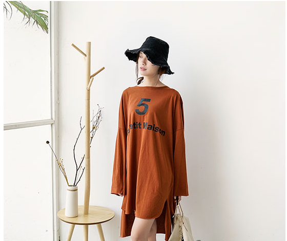凉快的早秋,能够穿上一件精约时髦的深棕色休闲长袖T恤裙,前短后长的不规则下摆规划,让大长腿展示无疑,更是非常显高瘦,宽松的版型舒适休闲,又特性十足~~
