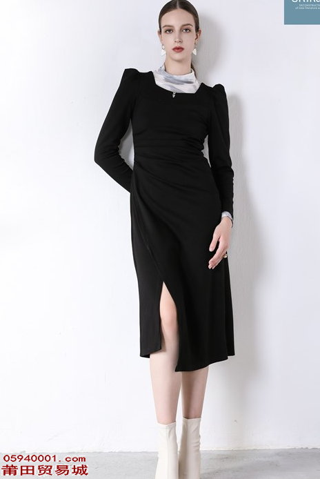 黑色修身法式高雅垫肩开衩连衣裙,更具立体感,修身的剪裁更是将女人的身段优势展示。法式的高雅与垫肩的立体感相结合,呈现出高贵的气质。而开衩设计则增添了几分性感与生动。